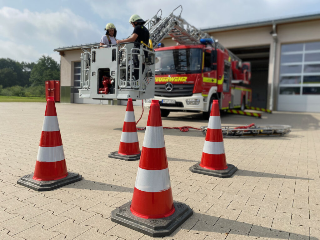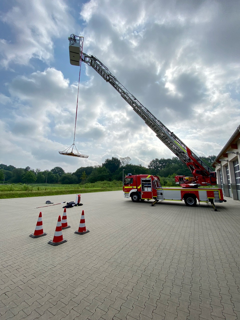 Nach einer kurzer Einweisung in den Ablauf des Dienstes ging es auch gleich an die Praxis. Björn brachte die DLK in Stellung, öffnete alle Rolladen und dann ging es an die Anbauteile und Gerätschaften des eigentlichen Fahrzeuges. Nach der Grundeinweisung in die Taktik kam als erstes die Möglichkeiten zur Menschen-/Personenrettung. Dazu wurde der „Safety-Peak“ am Korb der DLK angebaut und die Korbtrage mit den verlängerten Seilen angehängt. Um die Steuerung und Handhabung zu vertiefen, wurde ein kleiner Parcours mit Leitkegeln aufgebaut. Diese stellten das Ziel für die Trage dar, wo der Patient am Boden abgelegt werden musste. Nach dieser Übung wurde die Krankentragenlagerung auf den Korb angebracht und die verschiedenen Möglichkeiten der unterschiedlichen Tragen mit den Einsatzgrenzen von Björn erläutert.